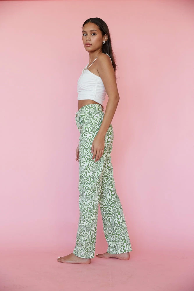 Make a statement in the Wyatt Wavy Straight Leg Jeans! Featuring a high rise fit, two side pockets, relaxed straight leg silhouette, and a retro wavy print for a bold look. Available in green and white.